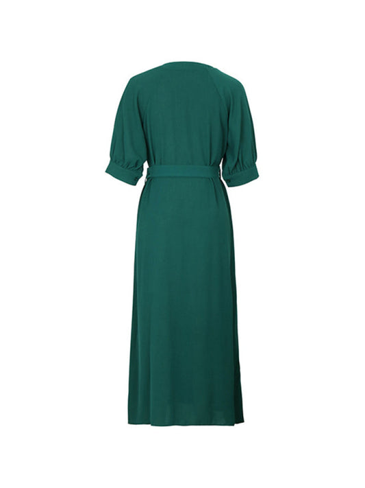 Solid V-Neck Belted Midi Dress with Button-Up Closure & Bishop SleevesRegular price $25.90 USDRegular priceUnit price / per$39.96 USDSale price $25.90 USDNew Price Drop!