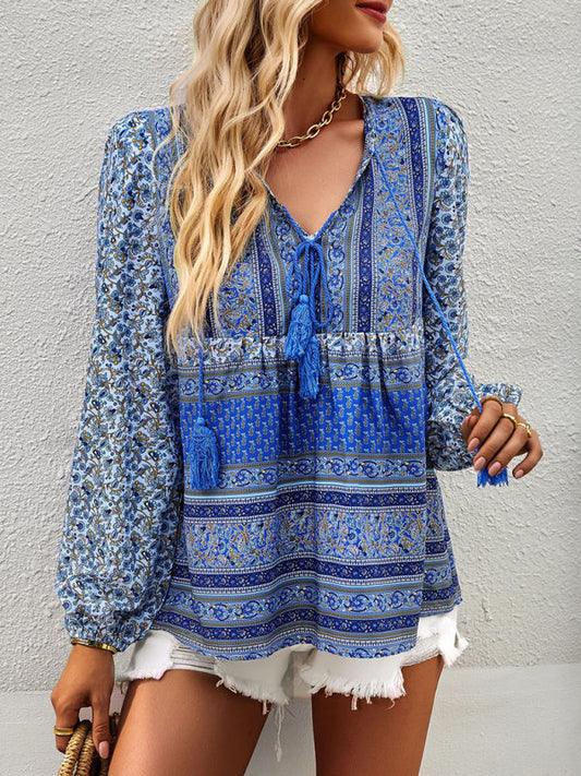 Women's Boho Floral Paisley V Neck Blouse: Lantern Sleeves, Tassel Tie