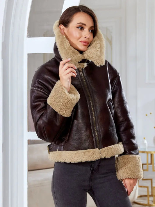 Damen Fliegerjacke aus Kunstleder mit Shearling-Futter für den Winter