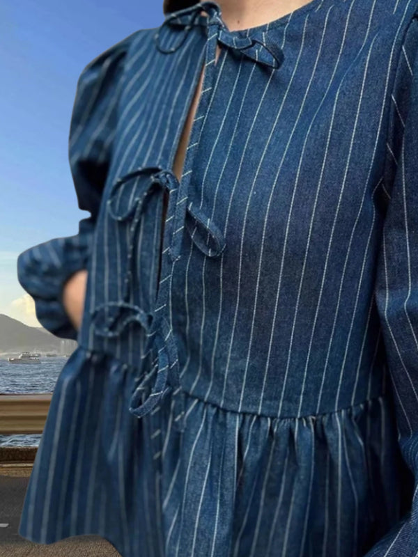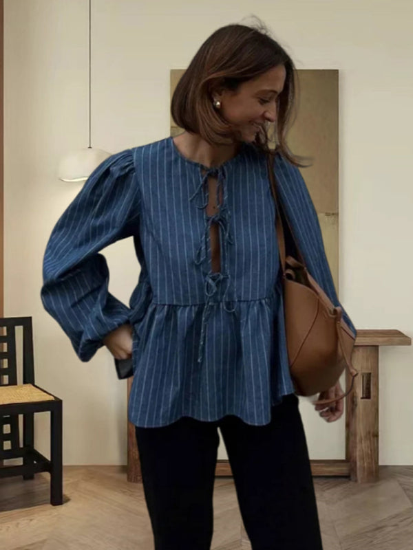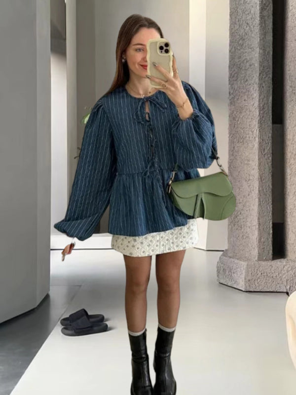 Women's Puff Long Sleeve Tie-Up Blouse in Stripes