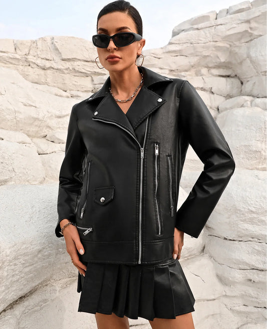 Women's Notch Lapel Faux-Leather Zip-Up Moto Jacket