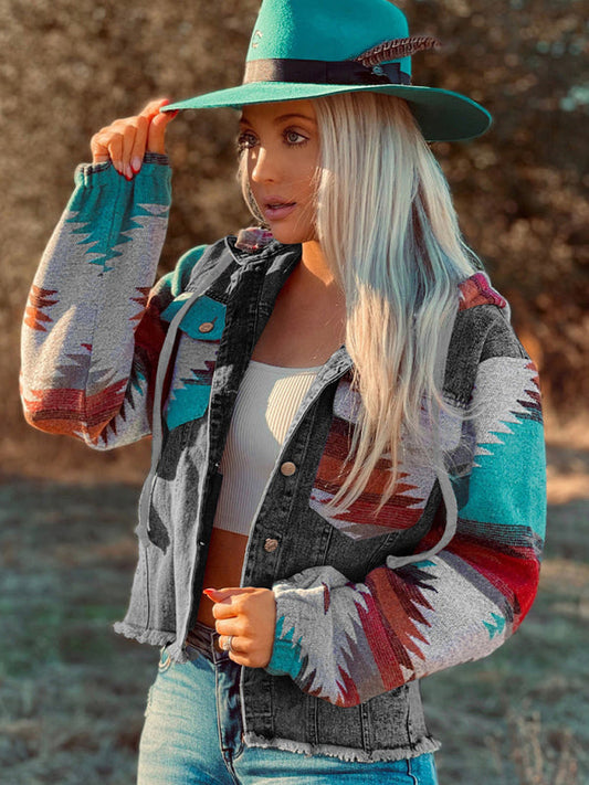 Washed Denim Aztec Print Hooded Shacket | Distressed Denim Hoodie Jacket