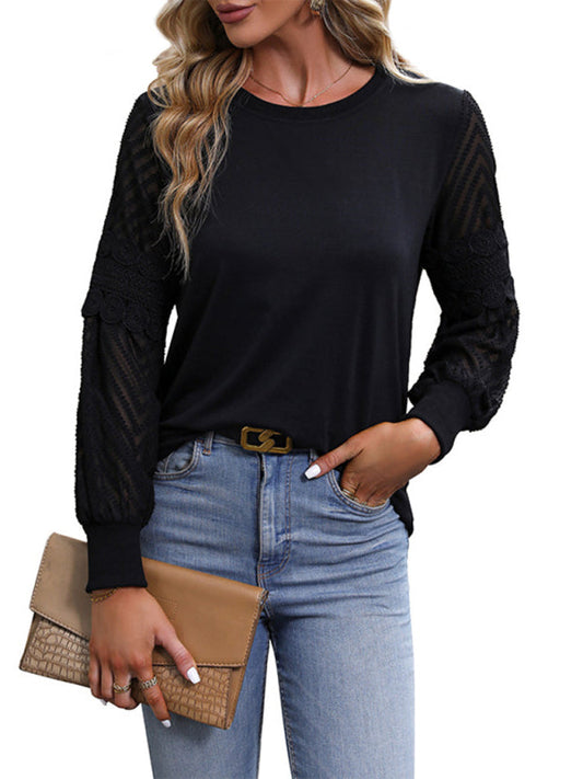 Sheer Lace Contrast Pullover - Round Neck Blouse