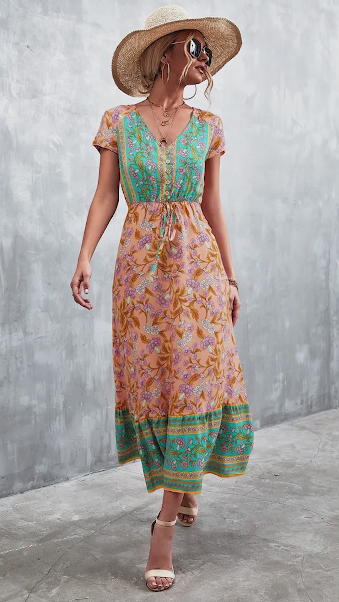 Floral V-Neck Waist Tie Ruffle Hem Midi Maxi Dress