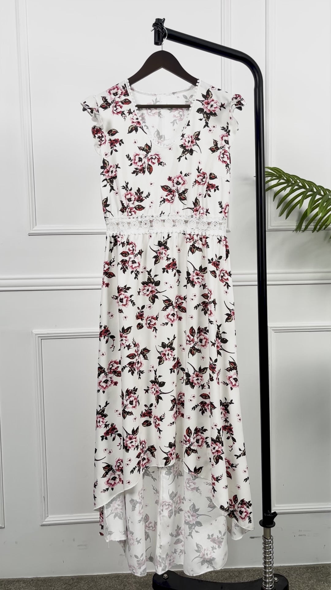 Cocktail Cotton Floral V-Neck High-Low Midi Dress with Lace Accents