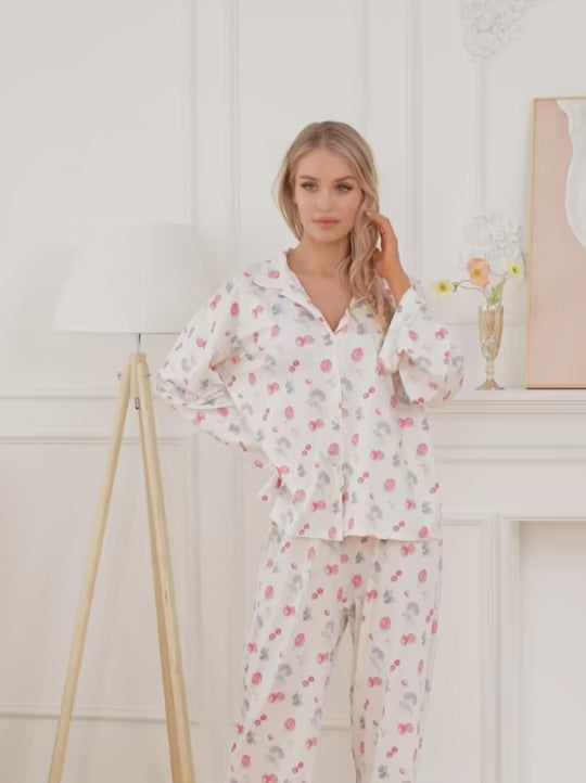 Get ready for cozy moments in this trendy berry print lounge set. Designed with a classic collar and flowy long sleeves, it offers a chic oversized fit. With a button-down closure and straight-leg pants, this set is a perfect match for stylish relaxation or a laid-back evening.