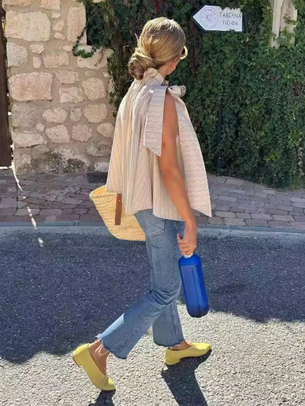 This sleeveless blouse is perfect for adding a touch of elegance to your casual outfits. With its stand collar and high ruffle neck, it exudes a chic and feminine vibe. The bowknot detail on the side adds a playful touch to the stripe print, making it versatile for various occasions from urban explorations to garden gatherings. Add this blouse to your wardrobe for a stylish and sophisticated look!