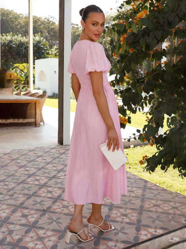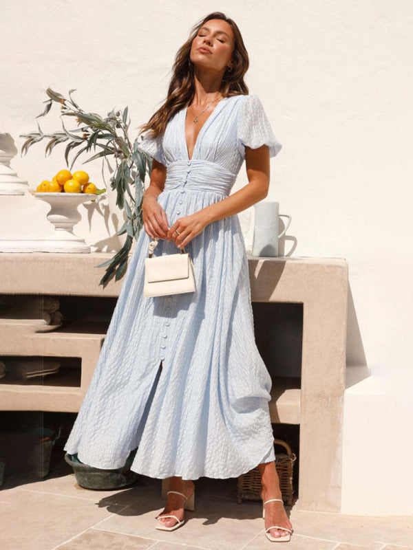 💫 Élevez votre garde-robe avec notre robe midi texturée boutonnée à manches bouffantes et plongeantes ! Cette superbe robe présente un décolleté en V profond, des manches courtes bouffantes et une silhouette ajustée et évasée flatteuse, parfaite pour toutes les occasions. La taille haute et la taille smockée assurent un ajustement parfait, tandis que le devant boutonné ajoute une touche de sophistication. Fabriquée à partir de tissu polyester texturé, cette robe est idéale pour le printemps, l'été et l'automne. Que vous assistiez à des festivals en plein air, à des événements en journée ou à des célébrations d'anniversaire, cette robe vous permettra de vous démarquer avec style ! ✨