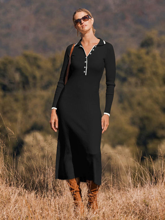 Robe mi-longue fourreau à manches longues avec col à bordure contrastée en tricot