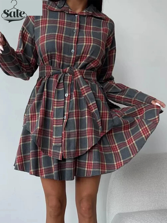 Fashion Loose Plaid 2 Piece Sets Women Outfit 2025 Elegant Long Sleeve Shirt With High Waist Mini Skirt Set Female