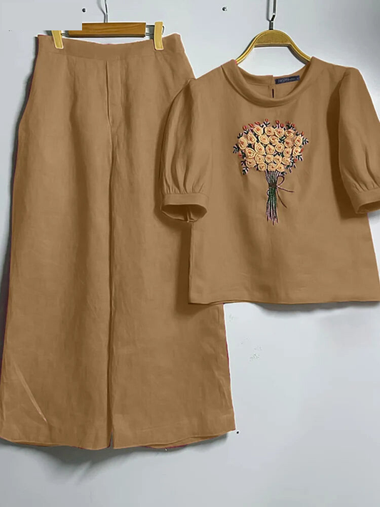 Fashion Short Sleeve Floral Embroidery Blouse Wide Leg Pants Sets 2PCS Women Summer Tracksuit Casual Loose Trousers Suits