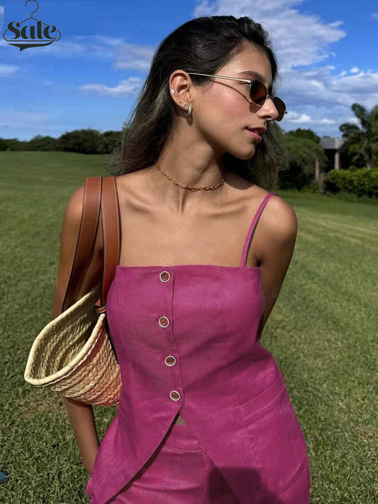 Summer Loose Pink Cotton Trousers Set 2 Pieces Women 2025 Sexy Sleeveless Tank Top With High Waist Wide Pants Set Female