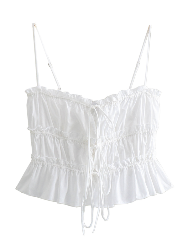 This solid ruched tie-up cami top is a must-have for your summer wardrobe. The sweetheart neckline and slim fit silhouette add a touch of femininity, while the adjustable spaghetti straps ensure a comfortable and customizable fit. Whether you're out for a casual day or attending a seasonal festival, this cami is versatile and stylish for various occasions.
