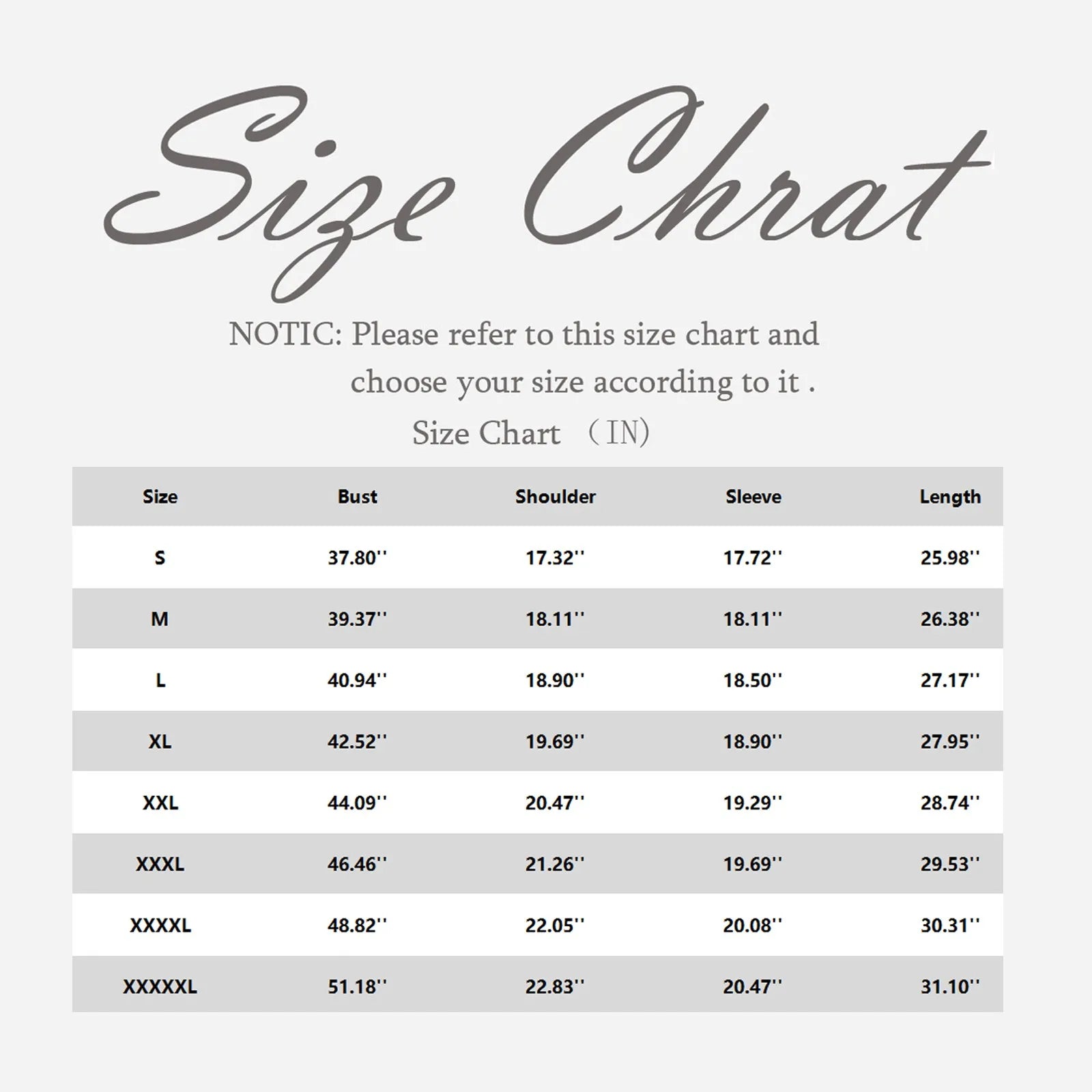 • XXXL: US 16, UK 18, Length 28.74", Bust 49.61", Shoulder 20.08", Sleeve Length 11.02"