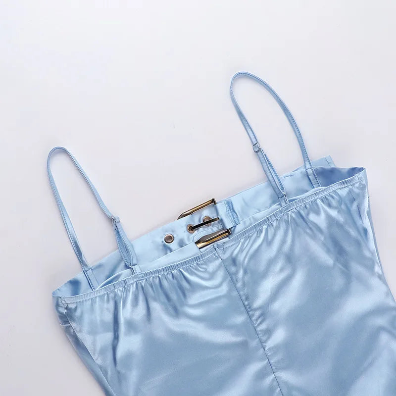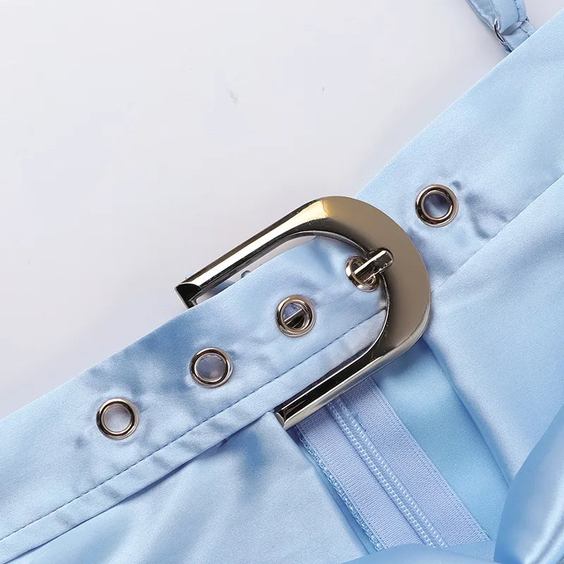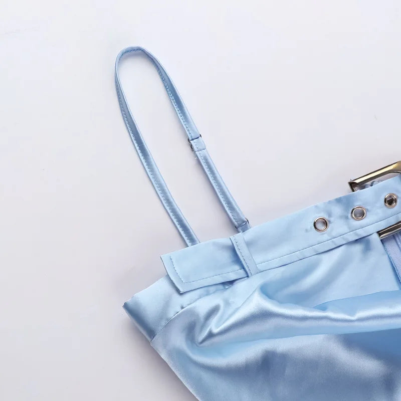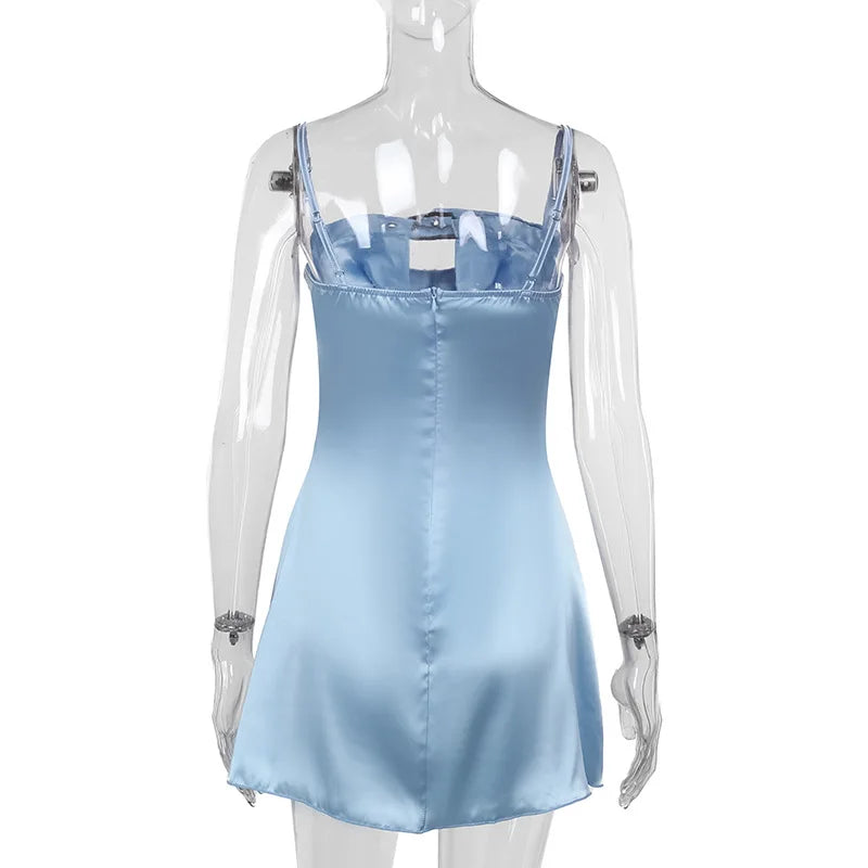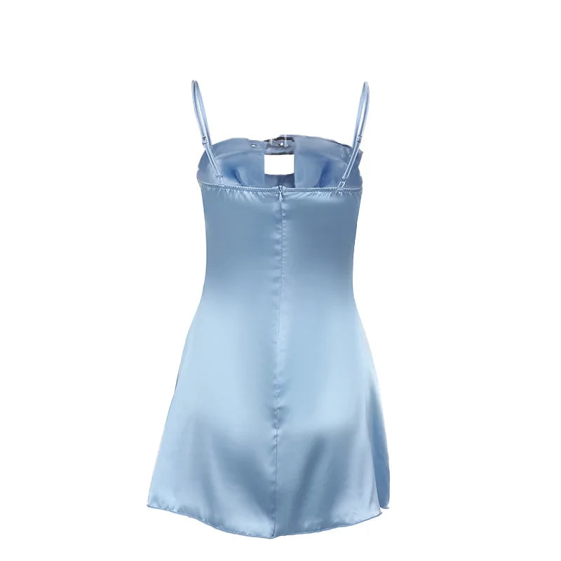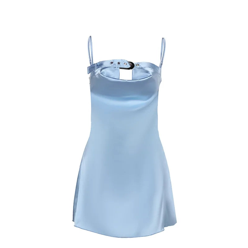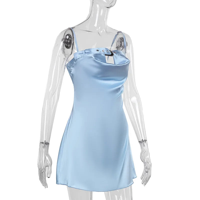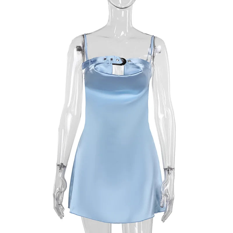 💫 Turn Heads in Our Satin Mini Dress! This stunning satin mini dress is the perfect blend of elegance and allure. Featuring a unique cut-out neckline with an eye-catching buckle detail, it's designed to showcase your fashion-forward style. The adjustable spaghetti straps ensure a perfect fit, while the empire waist and flowing A-line silhouette flatter any figure. Whether you're stepping out for a cocktail party, heading on a romantic date, or dancing the night away, this dress guarantees you'll look fabulous. Its satin finish adds a touch of luxury, making you the center of attention wherever you go. Don't miss out on owning this must-have piece for your wardrobe this summer!