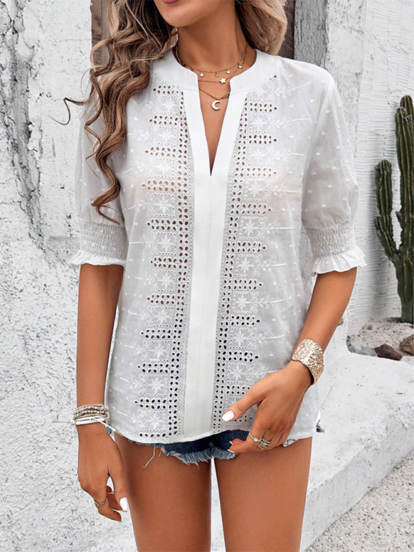 Eyelet V-Neck Top - Women's Puff Sleeves Blouse
