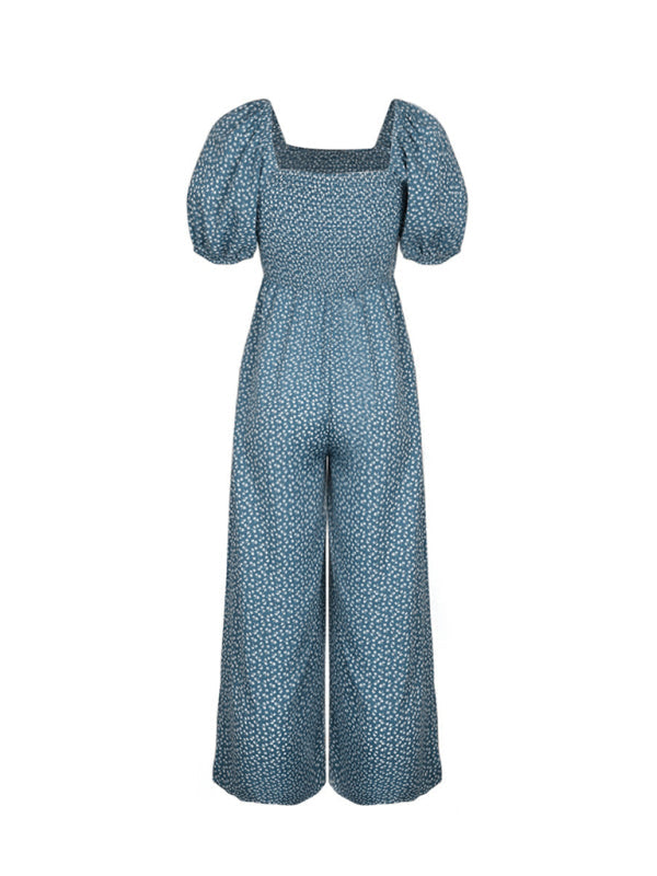 Floral Print Jumpsuit - Women's Square Neck Wide-Leg Playsuit with Smocked Bodice