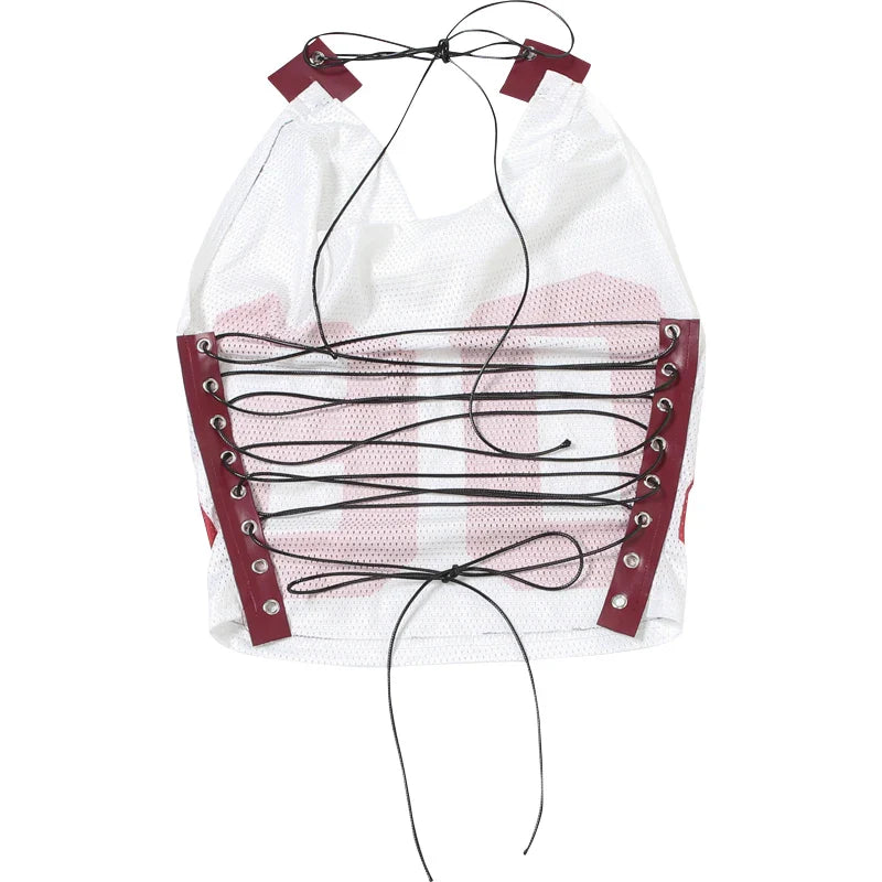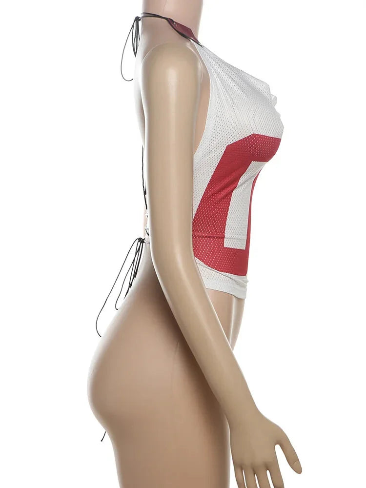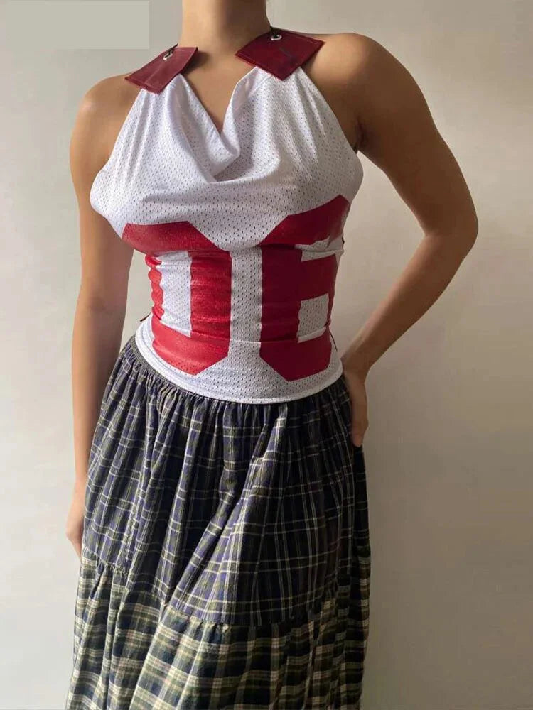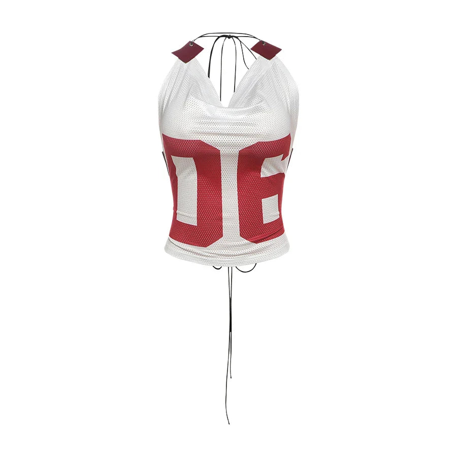 Introducing our Women Football College Top for Girls with Lace-Up Back Backless halter Top! This top is the perfect blend of sporty and stylish, designed for the modern woman who loves both comfort and fashion. The cowl halter neck and sleeveless style offer a chic and athletic look, making it ideal for game days, sports events, and college gatherings.