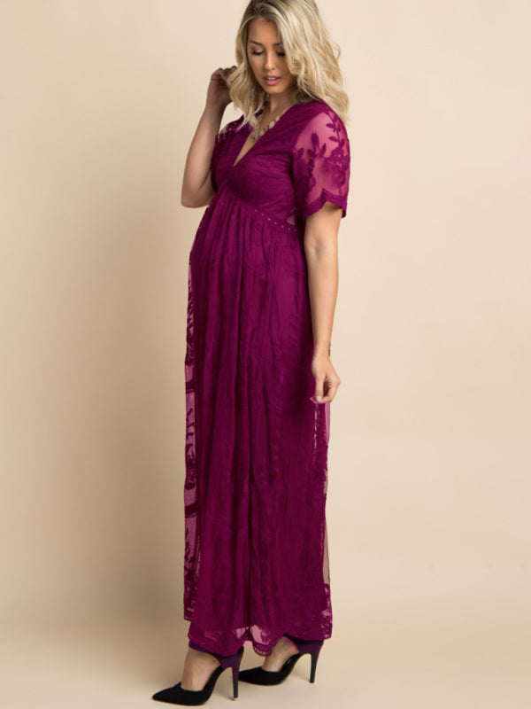 Trendy Lace Maternity Dress with Chic V-Neck Design