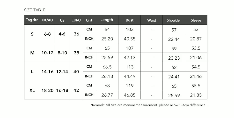 - XL: Bust Size - 119, Length - 68, Shoulder Width - 65, Sleeve Length - 55