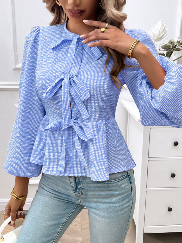 • Embrace elegance and comfort with our Gingham Bow-Tie Blouse. Its eye-catching design and flattering fit make it a versatile piece for any wardrobe. This stylish blouse pairs beautifully with jeans for a casual look or with a skirt for a more dressed-up occasion. Don't miss out on adding this adorable piece to your collection!