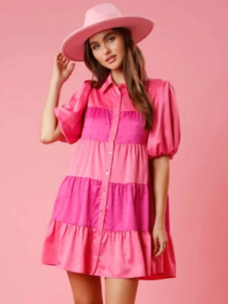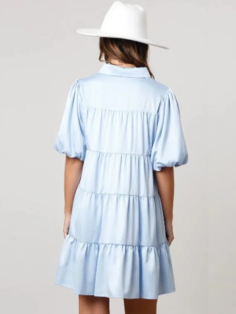 Elevate your casual style with our Solid Tiered A-Line Loose Shirt Dress with Puff Sleeves! This dress is a perfect blend of comfort and style, featuring a classic collared neckline and short puff sleeves for a touch of elegance. The tiered design adds a playful element to the A-line silhouette, while the loose fit and button-up closure ensure a comfortable and relaxed wear. Made with polyester fabric that offers no elasticity, this dress is ideal for various occasions from family gatherings to casual outings and vacations. Embrace the sunny vibes of spring and summer with this chic shirt dress! ☀️
