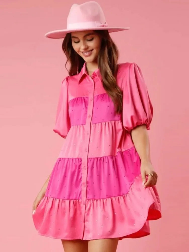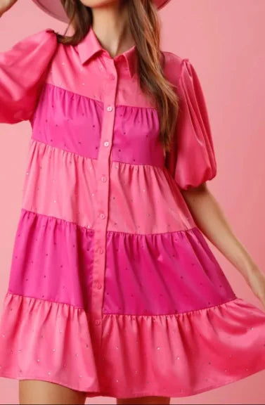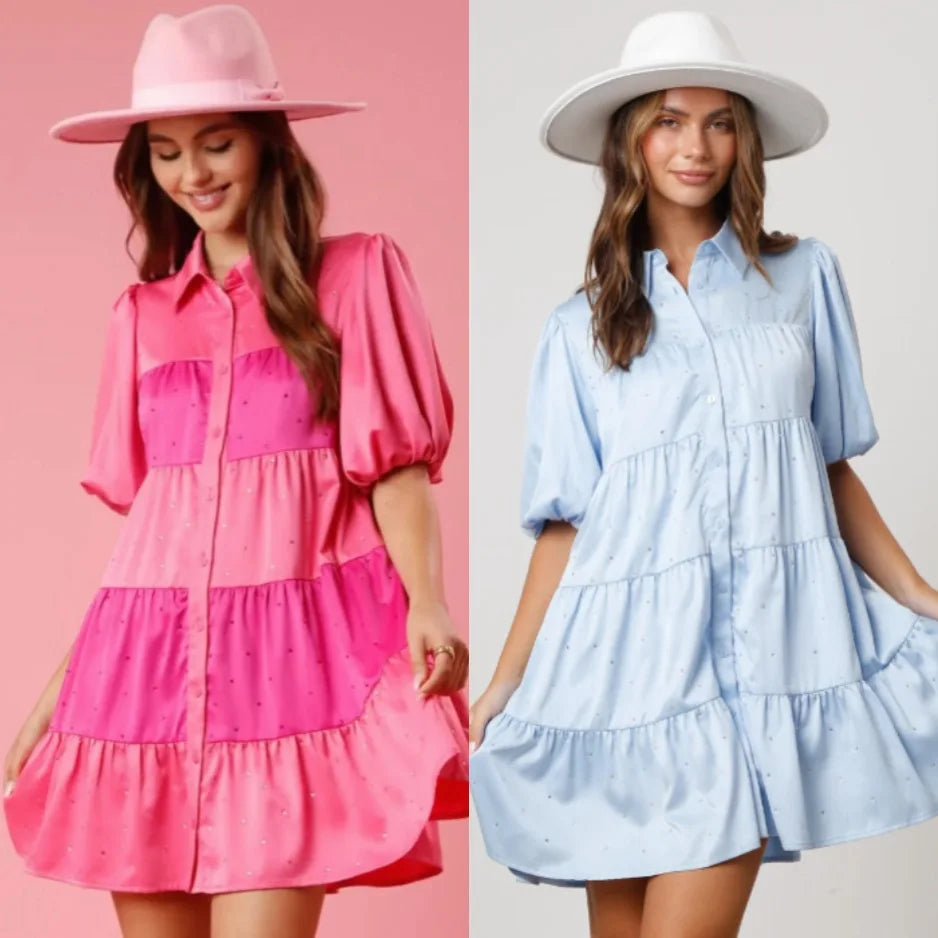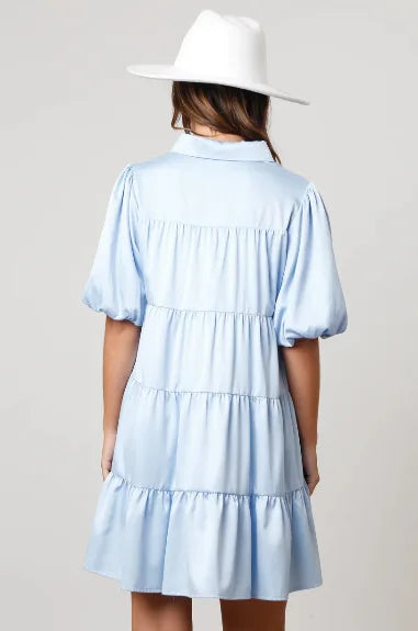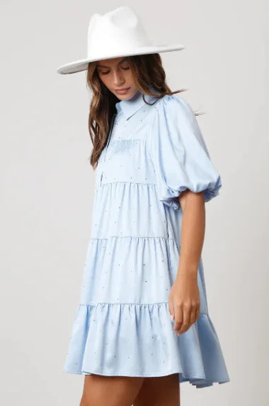 Tiered A-Line Shirt Dress with Princess Beading and Puff Sleeves