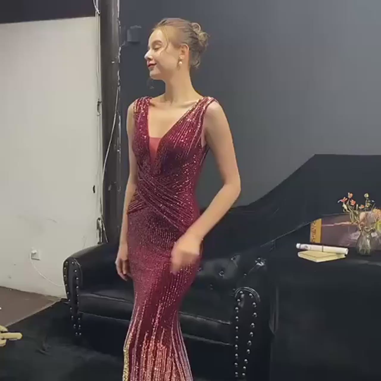 Elevate your evening look with this fashion-forward red sequin mermaid dress. Designed with a plunging V-neckline and a fitted waist, it flatters your curves while exuding modern glamour. Perfect for VIP receptions or opera nights, this dress ensures you stand out with its shimmering ombré effect and luxurious feel.