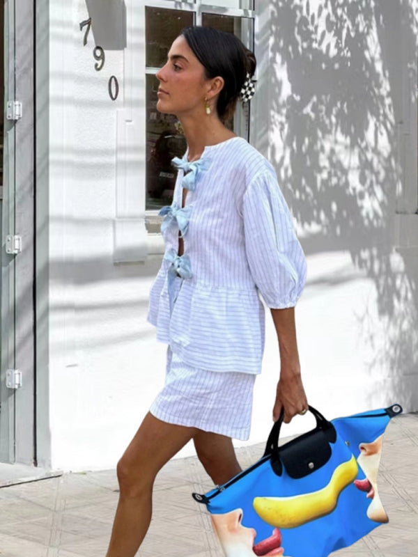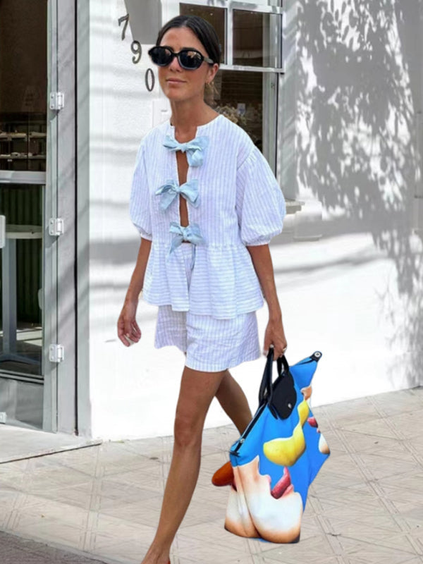 Relaxed Vacation Striped Tie-Bow Blouse & Comfy Shorts Set for Vacay