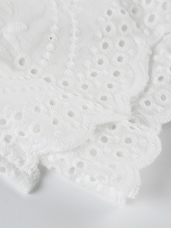 - Design Details: Shirred bodice with a flouncy layered eyelet lace hem