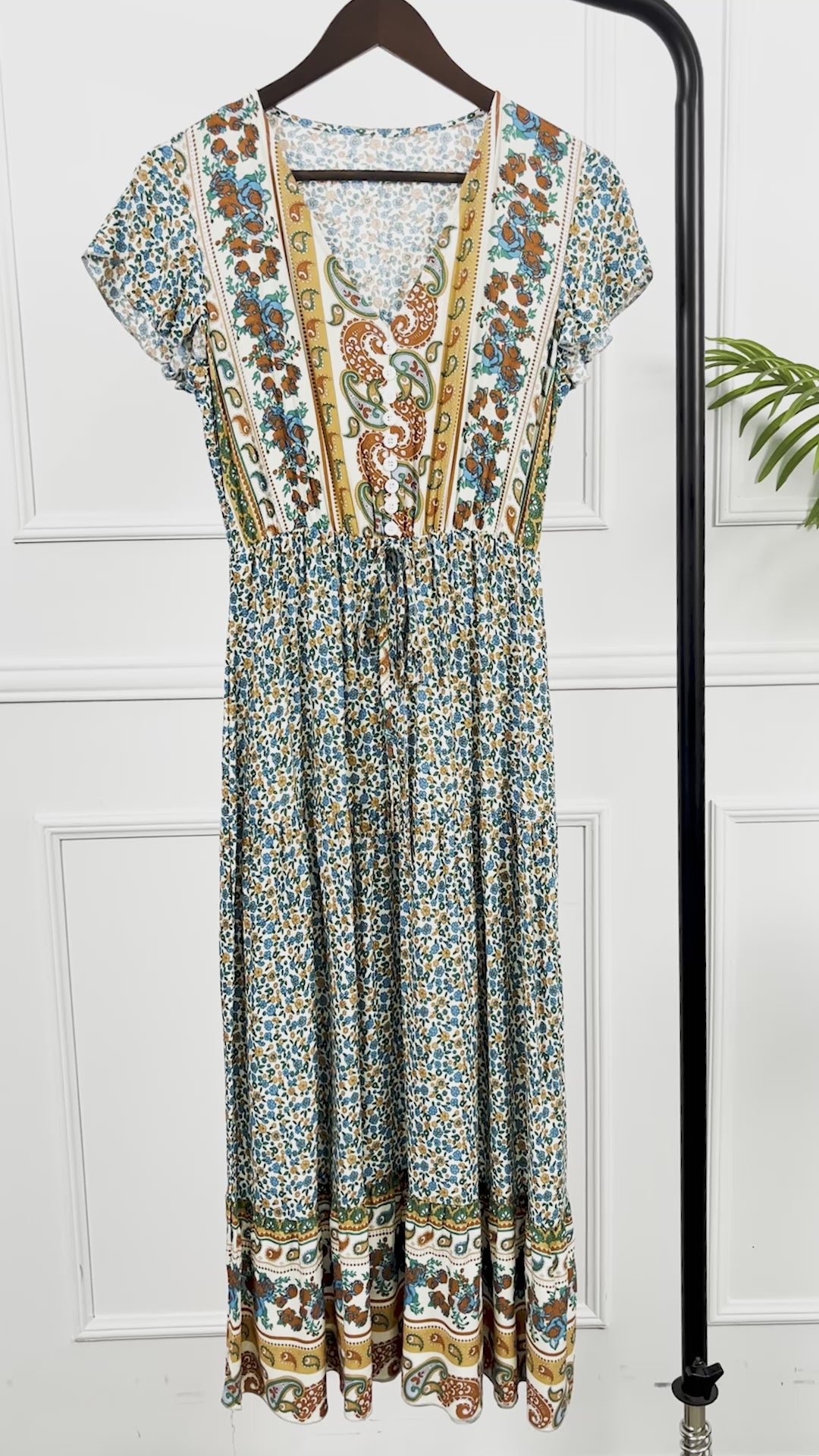 Summer Floral Short Sleeve V-Neck Tie-Waist Midi Dress