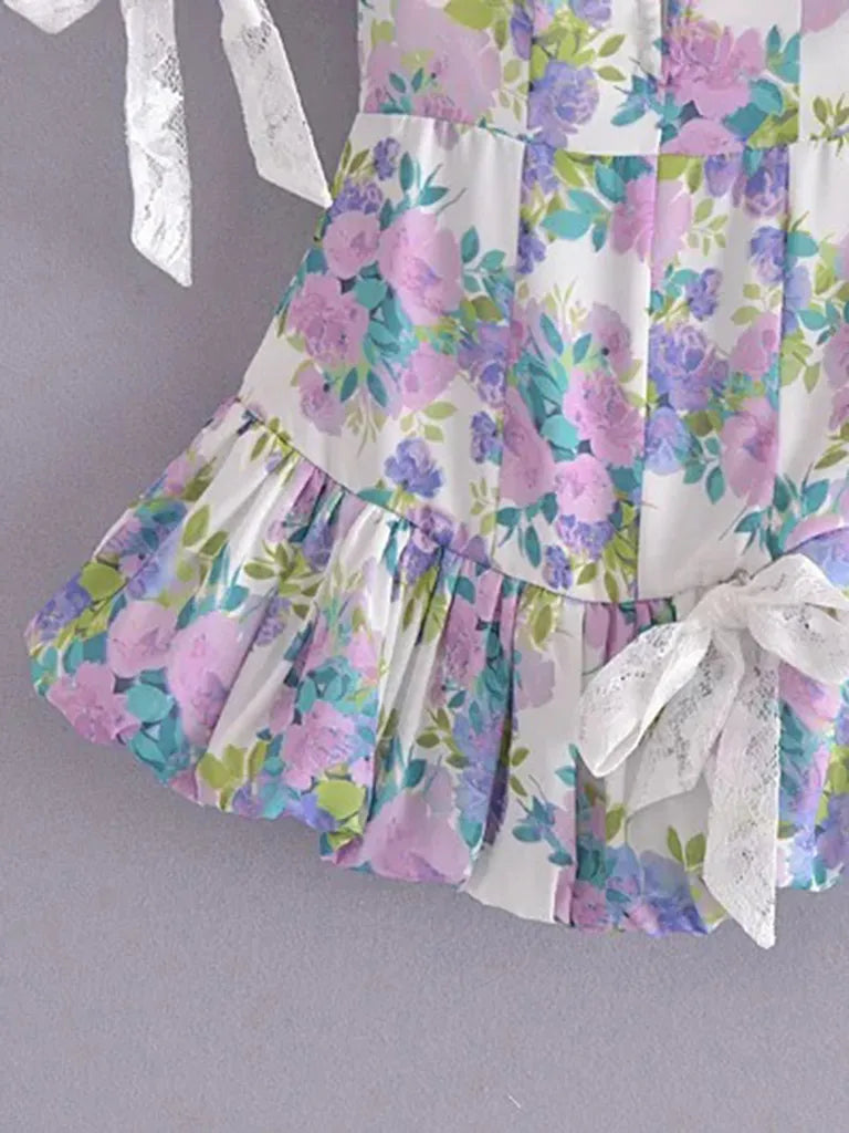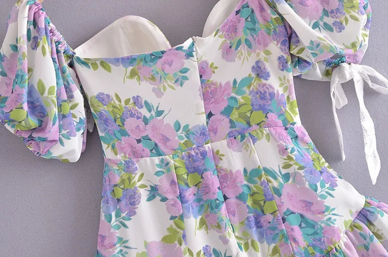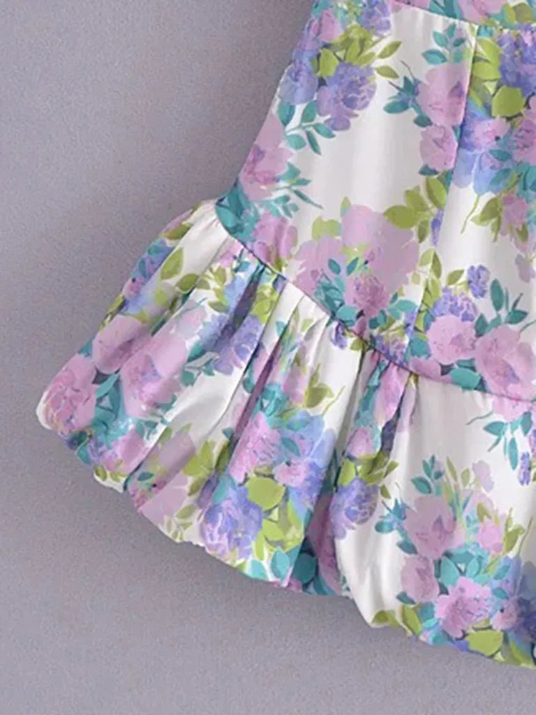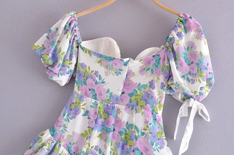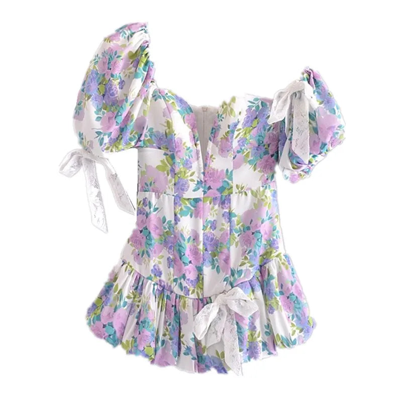💃🔥Vintage Women's Floral Remi Plunging Neck Puff Sleeves Mini Dress💃🔥