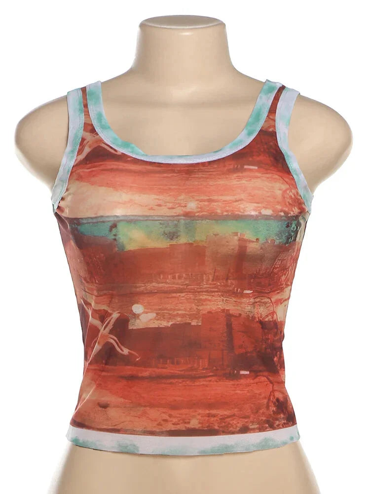 Introducing our Women's Vintage Sunset Print Tank Top! This tank top is the perfect addition to your spring and summer wardrobe. The scoop neck with straps and sleeveless design offer a chic and comfortable fit, making it ideal for various casual occasions.