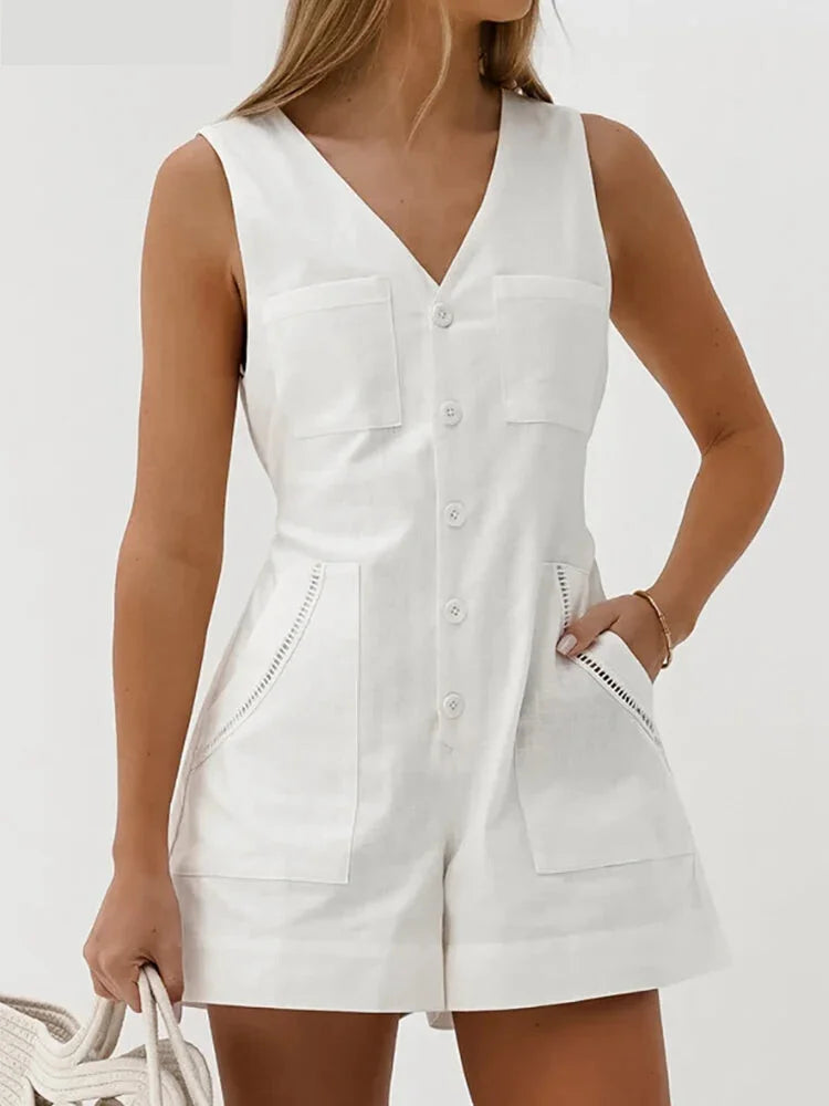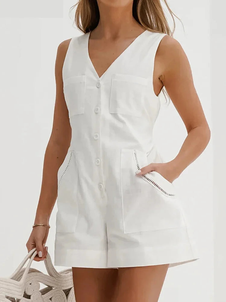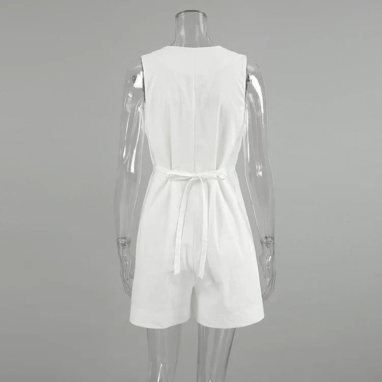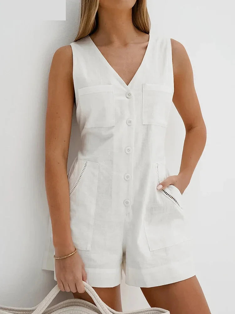 Introducing our Women Solid Cotton Button-Up V-Neck Romper Playsuit with a Tie-Back Design, the perfect blend of style and comfort for your spring and summer wardrobe! 🌷☀️