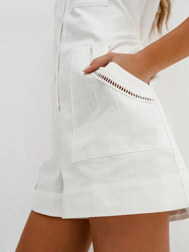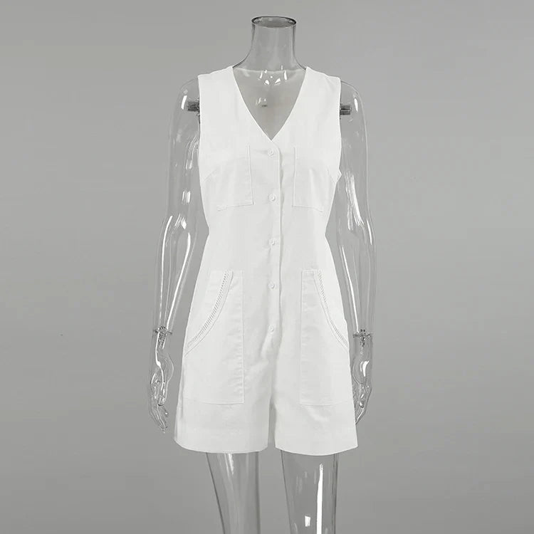 Solid Cotton Button-Up Romper for Summer Walks