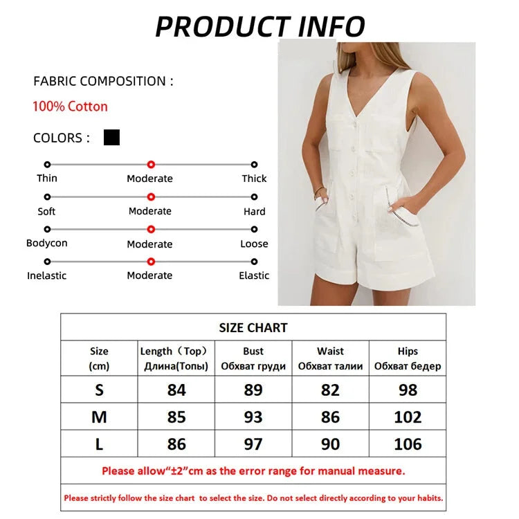 Available in sizes S, M, and L, with precise measurements for the perfect fit. Embrace leisurely bike rides, park strolls, and sunset watching in style with our Women Solid Cotton Button-Up V-Neck Romper Playsuit! 🚴🌳🌅